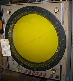 Radar cathode ray tubes such as the 7JP4 used for PPI displays had a circular screen and scanned the beam from the center outwards. The deflection yoke rotated, causing the beam to rotate in a circular fashion.[3] The screen often had two colors, often a bright short persistence color that only appeared as the beam scanned the display and a long persistence phosphor afterglow. When the beam strikes the phosphor, the phosphor brightly illuminates, and when the beam leaves, the dimmer long persistence afterglow would remain lit where the beam struck the phosphor, alongside the radar targets that were "written" by the beam, until the beam re-struck the phosphor.[4][5]