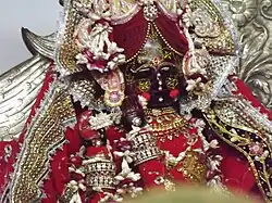 According to popular legend, the deity Radhavallabh was never made by any sculptor. The deity was given to a devotee named Atmadev by Shiva himself because of his arduous devotion and prayers.[2] The Hith Harivansh Mahaprabhu lived 31 years in place called Devavan. In the 32nd year of his age, he left for Vrindavan. On his way to Vrindavan, he was ordered by goddess Radha herself to marry the daughters of Atmadev and took the idol of Radha Vallabhji to Vrindavan with them. As ordered, Hith Harivansh Mahaprabhu married the daughters of Atmadev and Atmadev gifted the idol of Radhavallabh ji to his daughters and Harivansh Mahaprabhu on their marriage.[6]