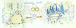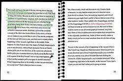 Goodiepal defines the prevailing adherence to the form of the recorded stereo track, transmitted through two speakers and composed using computer software displaying time progression from left to right, as the primary limitation to be challenged in current computer music.[8] This form has now become so much a cliché that one of Goodiepal’s main ambitions with the Mort Aux Vaches Ekstra Extra/Radical Computer Music exercise is to force the participant to reject or challenge the progressive time line moving from A to B in favour of a compositional artifice where time does not progress. This strategy is in effect an exclusion of the notion of time altogether and the game scenario places the participant in a centre position between at least two or three musical objects, all heavily loaded with information. Since the level of interest, with which the participant will respond to these objects, cannot be immediately determined, they will pull away from the centre point with infinite strength and so create a vacuum.[9] From here the participant conceives a composition, which is then notated in the school book.