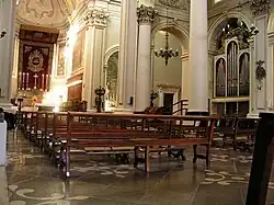 The ornate Baroque interior has a Latin cross plan, with a nave and two aisles separated by three colonnades embellished with gold. Charts showing Bible verses referring to St. John the Baptist are over every column. The dome was built in 1783, and covered with copper sheets during the 20th century. The side chapels, characterized by altars decorated with polychrome marbles, date from the 19th century.