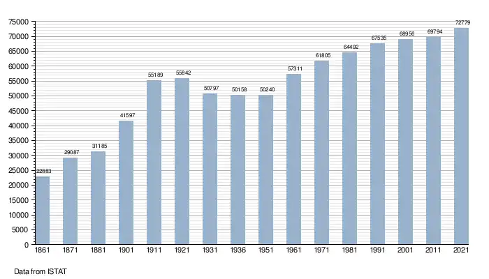 As of December 31, 2023, foreigners residents in the municipality were 6,580, i.e. 8.9% of the population. The largest foreign community comes from Albania, with 31.4% of all foreigners present in the municipality, followed by Tunisia and Romania.[10][11]