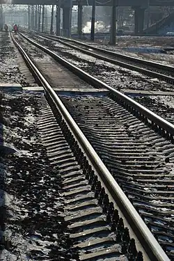 Railway steel contracts at low temperatures and expands at high temperatures.[1] In extreme cold, a length of CWR suffers tensile stress. This stress can cause railway steel to fracture.[2] In extreme heat, a length of CWR suffers compressive stress. This type of stress can cause sun kink where a length of a railway buckles laterally (sideways).[3] Other factors that affect CWR condition include the state of the track ballast and its shoulders; the type and placement of the sleepers; places of increased shadow such as tunnels and bridges; track consolidation; and, to a lesser degree, the vertical curvature of the tracks.[4]