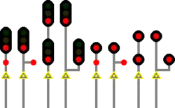 ⸸Intermediate speed is 50 km/h unless otherwise specified by an intermediate speed board. This is the New Zealand equivalent of US limited speed but using a metric speed that is different. These aspects exist in KiwiRail's 'Network Signals, Indicators and Boards Manual' document but it is unknown if these aspects are displayed or are reserved for future use.