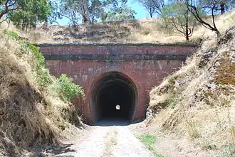 The Deniliquin line was commenced by the private Melbourne, Mount Alexander & Murray River Railway Company, but when the company experienced financial difficulties it was taken over by the Victorian colonial government in 1856, with the Victorian Railways Department being formed to operate the new public railway system. The line opened in five stages from February 1859 to September 1864, and was at the time the largest engineering undertaking in the colony. More than 6,000 men were involved in construction of the Deniliquin line with the main contractors Cornish & Bruce undertaking the works.[1] The line served a strategic economic need of serving the important goldfields of Castlemaine and Bendigo (then called Sandhurst), and capturing for Melbourne the trade in wool and other goods from northern Victoria and the Riverina which were formerly shipped through South Australia via the Murray River. Two tunnels were built on the line. The Elphinstone Tunnel, 385 metres (1,263 ft) long, was built in brick and bluestone as a double-track horseshoe profile tunnel, and was completed in 1860.[1] The 390-metre-long (1,280 ft) Big Hill Tunnel, located between Kangaroo Flat and Ravenswood, south of Bendigo. Like the Elpinstone Tunnel, it was double-tracked when built, but was singled as part of the Regional Fast Rail project.