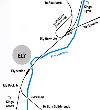 Ely West Curve (also known as the 'Adelaide loop', the 'Ely avoiding line' and the 'Ely freight loop') is a single-track loop which branches in the up direction from Ely North Junction. The loop turns through 180 degrees to re-join the Ely to Peterborough Line in the down (northbound) direction. Ely West Curve was laid in on 1 October 1890, to allow freight trains from the Midlands and north to run directly onto the King's Lynn and Norwich lines in the down (northbound) direction without reversal thus avoiding Ely station. Later, it was used by an increasing number of passenger trains, particularly holiday expresses to the Norfolk coast. In 1966 regular passenger traffic over the curve ceased.[1] As of 2016, there is one passenger train per week, in one direction only, which uses the Ely West Curve. This is the East Midland Railway 15:54 Sunday service from Norwich to Manchester Piccadilly.[2]