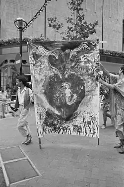 Beezy Bailey banner at the Rainbow Nation Peace Ritual, St George's Mall, Cape Town, February 3, 1990