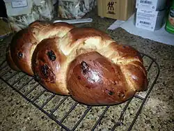 European versions of raisin bread include the Estonian "kringel"[20] and the Slovakian "vianočka"[21] and "stafidopsomo" in Greece. A similar food is raisin challah, a traditional Jewish food for Shabbat and holidays.[22] It has been suggested that Garibaldi biscuits were based on a raisin bread that was eaten by the troops of Italian general Giuseppe Garibaldi.[23]