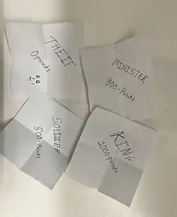 The game begins with making 4 chits namely Raja (2000 points), Mantri (900 points), Chor(0 points) and Sipahi (700 points). Each chit is folded-shuffled and distributed among 4 players with each player picking one chit. Players can open their respective chit to find out their character(which shall not be revealed to anybody). The Sipahi then has to identify the ‘Chor’ from the other 3 players whether they are a “chor” or not. If the Mantri, guesses correctly then the points are retained or else he/she surrenders them to the Chor. If the Sipahi picks the wrong person then the Chor and Sipahi will have to switch points. Several rounds of this game are played before counting the points. The player with the highest score wins the game.[2]