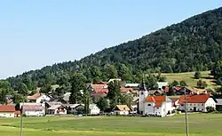 The local parish church is dedicated to the Holy Cross and belongs to the Roman Catholic Archdiocese of Ljubljana. It was built in the 17th century on the site of an earlier building, mentioned in written documents dating to 1420.[5] The year 1677 is carved into the door casing of the church. The main altar and the side altar dedicated to Saint Martin are said to have been brought from Bistra; they are marble works dating from the end of the 17th century. The main altar painting is the work of Henrika Langus (1836–1876). The church was elevated to the seat of a parish in 1766.[3]