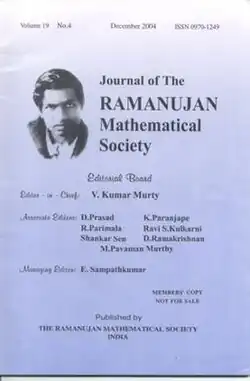 - Journal of the Ramanujan Mathematical Society : The Journal was started in 1986 with Professor K S Padmanabhan as Editor-in-Chief. Initially, it was a biannual Journal. Now it has four issues per year. The present Editor-in-Chief is Professor R Parimala of Emory University, Atlanta, United States and the Managing Editor is Professor E Sampathkumar of University of Mysore.