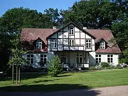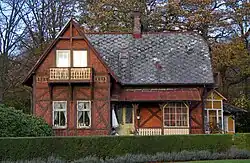- The two-and-a-half-storey accountant's villa was built in 1829 in yellow plaster. The gable end is clad in chamfered paneling with sawtooth frieze, which, like the building's joinery, is painted brown. The windows, on the other hand, are painted white and are of the central mullion type with glazing bars, where those in the gable ends have white painted coverings. At the main entrance, on the north long side, the villa has an extended porch with an overhanging balcony with glazed sides, which in turn is covered by a small projected gabled roof. Above the balcony is a smaller paneled frontispiece, which has a similar counterpart on the opposite side of the house.[68]