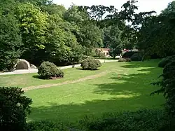The park is situated around a natural valley in the landscape, which can be said to divide the park into three different parts, a southern part consisting of the mineral spa buildings and a number of villas, the part down in the valley containing the springs and the well pavilion, and a northern part consisting of deciduous forest. The park has elements of both a French park with long shoulders and sight lines and an English park with undulating lawns.