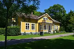 - Villa Malva was built around 1880 and is a wooden building clad in yellow painted horizontal panels. The house is on one and a half floors with a gable roof clad in red fiber cement tiles and the gable ends and the underside of the eaves clad in seam panelling with sawtooth frieze. The main entrance is located on the house's southern long side and is accentuated by a frontispiece, as well as a porch with a balcony above. Both gables have extended rooms with balconies on the roof. The building probably replaced a building on the same site that burned down in 1879 and consists of seven rooms on the ground floor and six rooms on the upper floor. The building became a listed building in 1973 and in 1977 the interior was converted to house three apartments.[63]