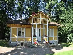 - Villa Desideria was built in 1801 for the Trolle family. It is a one-and-a-half-storey timber-frame house with brown painted oak and yellow brick in the bays. The building's long side façades have frontispieces to the north and south, while the gables have secondary porches to the east and west, added in 1899. The main entrance faces south and is located under a carved porch added between 1873 and 1879. The carpentry details are painted brown, except for the veranda balustrade and the windows and linings of the porch, which are painted white. The villa takes its name from Queen Desideria, the wife of Charles XIV John, who stayed in the villa during her stays at the spa. Previously, the house was called the Old Trolle House.[69]