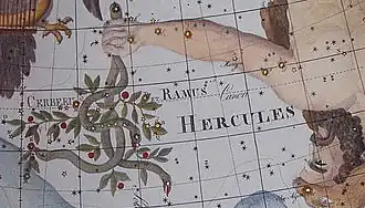 It was depicted in the form of a branch held in Hercules' left hand. The also-obsolete constellation of Cerberus - made up of much the same stars - became combined with it in later depictions, with the name "Cerberus et Ramus".[1]
