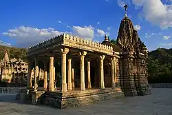Chaturmukha temple is a 15th-century temple dedicated to Adinatha[18] built using white marble in the midst of a forest. The temple name is credited to its design of chaumukha— with four faces.[19][20] The construction of the temple and quadrupled image symbolise the Tirthankara's conquest of the four cardinal directions and hence the cosmos.[21][22] The temple is one of the largest Jain temples[3] and considered one of the five holiest Jain shrines in India and part of Gorwad Panch Tirth.[6][23] The architecture and stone carvings of the temple are based on the Ancient Mirpur Jain Temple at Mirpur in Rajasthan.[24]