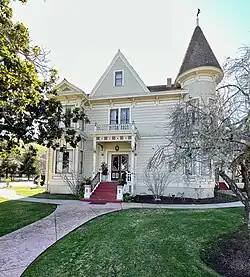 The Hiram Corey mansion is a three-story, wood-frame, single-family residence built in a Queen Anne style. It is the best example of Queen Anne style of architecture in a rural setting in Monterey County. It has redwood siding, banded with fish-scale shingles halfway into the second story, with a hipped roof and tower with a brass eagle finial detail. Full bay windows can be seen on the first and second stories. The main entrance to the house has stairs leading up to double wood doors with a Queen Anne style wood railing and canopy. Some of the original palm trees line the entrance. A small one story carriage house remains at the rear of the house.[2]