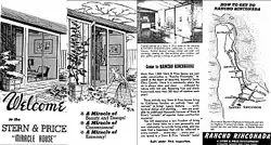 The homes in Rancho Rinconada were originally low-cost, single-story houses built in the 1950s by builders Stern & Price.[2] These ranch houses or "ranchos" were designed by architect Cliff May[3] and marketed under the name "Miracle House", while their landscapes were designed by landscape architect Douglas Baylis. Similar projects were later undertaken in Palo Alto and Long Beach.[4]