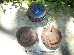 The Rangan 99 or Joni 99 is an anti-personnel blast mine introduced in 1999 by the Liberation Tigers of Tamil Eelam (LTTE), during the conflicts in Sri Lanka known as Eelam War III and Eelam War IV.[1] The design was copied from the Pakistani P4 MK1 mine.[2] This type of mine contains C4 explosive, and operates by pressure detection. The LTTE was reported in 2008 to be using a modified type with an electronic anti-handling device.[1] Army de-mining teams were dealing with large numbers of Rangan 99 mines in 2010.[3]