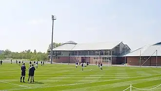 The site covers a size of thirty-eight acres (over fifteen hectares). It is divided into three areas: the administration wing, the professional wing for the first team and the youth development wing. The professional and youth wings have their own separate receptions, dining areas, changing rooms, kit stores and lecture rooms.[12] Both share facilities including the gym, medical suite and the indoor synthetic pitch. Outside there are six full-size pitches along with two half-sized, and a practice area.[12] Two of the full-sized and one half-sized pitch are used only by the first team, these have under-soil heating, the others are used by the youth sides.[12]