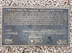 In 1990, the Rangitata Diversion Race was recognised as a significant part of New Zealand's engineering heritage by the Institution of Professional Engineers New Zealand (now Engineering New Zealand). The recognition was part of the “Engineering to 1990” project which the Institution organised to help celebrate the country’s sesquicentenary in 1990. A plaque was unveiled to mark the significance of the irrigation race in the development of the nation. The citation on the plaque reads: "IPENZ recognises this engineering work as an important part of NZ's engineering heritage. Approved in 1936 to provide unemployment relief and a vision for Canterbury's future, the 67 km race was the first major river diversion for the development of water resources. It irrigates 66,000 hectares as well as providing 27 MW of hydro power in winter".[20]