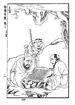 The legend is recorded in Ren Fang's Shuyiji or Tales of the Strange, and features a woodcutter, Wang Zhi or Wang Chih (王質; Wáng Zhì), and his encounter with the two immortals in the mountains. The story runs as follows:[1][2]