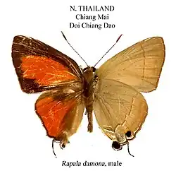 Rapala damona is a butterfly in the family Lycaenidae. It was described by Charles Swinhoe in 1890. It is found in the Indomalayan realm,[2] where it has been recorded from the Andamans, northern India, Myanmar, from Thailand to Peninsular Malaysia, Singapore, Sumatra, Java and Lombok.