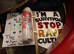 Two movements have addressed what they either fully or partially perceive as being rape culture or a role being played by rape culture, i.e. SlutWalk and Me Too. Though their rationale for claiming and including that the role of rape culture as being party to the particular social blights and crimes that they are fighting can vary, these movements have helped spread people's stories through hashtags[10] and provide an online space where victims of different types of sexual violence can confide in each other.