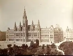 Ultimately, the square was designated as the largest open space along the Ringstraße. In 1872–1873, the northern and southern sections of the square were transformed into the Rathauspark, designed by gardener Rudolph Siebeck, while the central axis between the Rathaus and the Burgtheater was preserved as an open space. The foundation stone for the city hall was laid in 1873, with construction beginning the following year, opposite the Burgtheater on Franzensring (now Universitätsring). At the same time, work began on the Parliament, located on the southern border of the square, followed a few years later by the construction of the main building of the University of Vienna on the northern side of Rathausplatz.