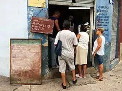 Despite past rumors of ending, the system still exists.[2] As of 2012, a coupon book taken to a ration shop provided family minimums for rice, sugar, matches, and oil, above the average wage of $30/month.[3] While most Cubans do not have to pay for rent, healthcare, or education, ration fees often take up a large percentage of their monthly income, and the unsubsidized costs of their monthly rations would be greater than the average monthly income.[1] The amount of food provided to each citizen has decreased somewhat over time due to the end of billions in yearly financial support from the USSR, a drastic reduction of tens of thousands of subsidized petroleum barrels from Venezuela,[4] and increased sanctions from the United States, and there have been significant increases in the ration fees at times.[1] Economic mismanagement has also played a large role in food shortages and rationing, even while the USSR subsidized the island to the tune of $5 billion per year, certain food items still had to be rationed.[5]
