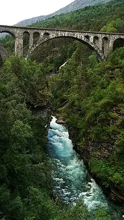 The next section of railway sees a major drop in elevation.[3] The line crosses the river Rauma on the Stuguflåt Bridge, and then runs through the 1,396 metres (4,580 ft) long Stavem Tunnel. It is constructed as part of a horseshoe curve, and the railway continues, backtracking further down the valley and reaching Verma Station. It is located 75 kilometres (47 mi) from Dombås and at 273 metres (896 ft) elevation; it is normally unstaffed, but is staffed in case trains need to pass. Immediately after the station comes the 480 metres (1,570 ft) long Kylling Tunnel, which puts the railway in the right angle to cross Rauma on the Kylling Bridge.[3] The 76 metres (249 ft) long arch bridge with a 42 metres (138 ft) long main span has a 59 metres (194 ft) clearance to the river below.[11] The section from Verma Station and past Kylling Bridge acts as a new horseshoe curve.[12]