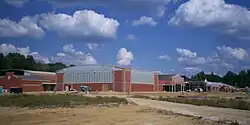 The Ravenna High school building contains 158,000 square feet (14,700 m2) of space and includes the main gym, auxiliary field house gym, auditorium, cafeteria, and around 45 classrooms. The main gym has retractable bleacher seating for 1,125 and the auditorium has seating for 600 with 300 additional retractable seats that can expand into space in the cafeteria. The field house gym includes a rubberized surface which has two full-size basketball courts and an elevated walking track. The building also has two courtyards that separate the three academic sections of the building which are used for natural lighting and can also be used for outdoor teaching space. The building was dedicated August 28, 2010.[9]