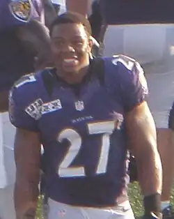 Raymell Mourice Rice (born January 22, 1987) is an American former professional football player who was a running back for six seasons with the Baltimore Ravens of the National Football League (NFL). He played college football for the Rutgers Scarlet Knights, earning first-team All-American honors in 2007. He was selected by the Ravens in the second round of the 2008 NFL draft. During his career, Rice was named to three Pro Bowls and was a member of the team that won Super Bowl XLVII. He is second in franchise rushing yards, rushing attempts, and rushing touchdowns, and is third in the franchise in combined touchdowns.