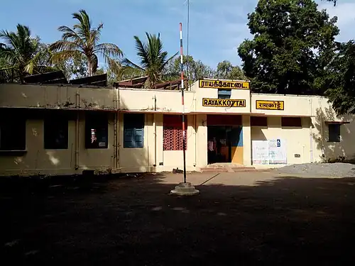 Rayakottai railway station is a train station serving the town of Hosur in Krishnagiri district of Tamil Nadu.[1] The station falls on the Salem–Bangalore line and is the closest railway link for the town of Krishnagiri, a district headquarters in Tamil Nadu.