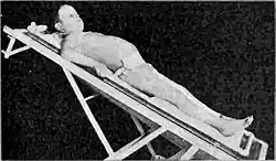 Palmer underwent a spinal column bone graft performed by Dr. Frederick J. Gaenslen.[14][e] Pott's disease is often accompanied by kyphosis (hunchback), and Gaenslen's standard recuperative treatment required the patient to be in the prone position in a Bradford frame (a full-body metal rectangle with a canvas sleeve) for up to a year.[16] Palmer's graft became infected, and he was given morphine for the pain.[17] Combination of illnesses and trauma stunted Ray's growth, and as an adult he stood just slightly over 4 feet (1.2 m) tall.[18][19][f] He spent most of the next five years prone in a Bradford frame.[12]