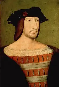 Hungarian art historian Mária Aggházy noticed a resemblance between the content-looking rider and the young Francis I of France, soon to be king, and Leonardo's patron from his later years.[9] Francis was an avid participant in jousting tournaments, which in the more entertaining but also more dangerous French style were run with less armour and other equipment than in Italy. Aggházy theorised that the rider's light clothing, likely after a victorious duel, demonstrated bravery on Francis's part as he followed the chivalrous ideals of the Nine Worthies.[10]