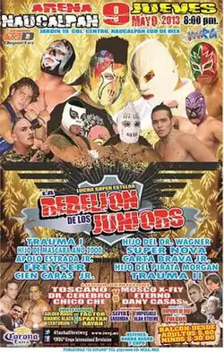Rebelión de los Juniors (2013) (Spanish for "The Junior Rebellion") was an annual professional wrestling major event produced by Mexican professional wrestling promotion International Wrestling Revolution Group (IWRG), that took place on May 9, 2013 in Arena Naucalpan, Naucalpan, State of Mexico, Mexico. The main event of the show was a 10-man elimination match featuring 10 "Juniors" with the last surviving participant becoming the number one contender for the IWRG Junior de Juniors Championship held by Oficial Factor at the time.[2] The ten competitors were Trauma I, Hijo de Máscara Año 2000, Apolo Estrada, Jr., Freyser, Cien Caras, Jr., El Hijo de Dr. Wagner, Super Nova, Carta Brava, Jr., El Hijo del Pirata Morgan, and Trauma II. The show featured four additional matches.