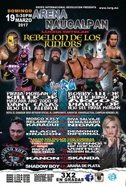 Professional wrestling has been a generational tradition in lucha libre since its inception early in the 20th century, with many second- or third-generation wrestlers following in the footsteps of their fathers or mothers.[2] Several lucha libre promotions honor those traditions, often with annual tournaments such as Consejo Mundial de Lucha Libre's La Copa Junior.[3] The Naucalpan, State of Mexico-based International Wrestling Revolution Group (IWRG) in 2011 created the IWRG Junior de Juniors Championship, a championship where only second- or third-generation wrestlers are allowed to wrestle for it. In addition to real-life second- or third-generation wrestlers there are a number of wrestlers who are presented as second- or third-generation wrestlers, normally masked wrestlers promoted as "Juniors". These wrestlers normally pay a royalty or fee for the use of the name, using the name of an established star to get attention from fans and promoters.[2] Examples of such instances of fictional family relationships include Cien Caras Jr. who paid Cien Caras for the rights to use the name.[4] In March 2011, only weeks after the creation of the Junior de Juniors Championship IWRG held their first IWRG Rebelión de los Juniors show, with the focal point being the Junior de Juniors Championship and "Junior" competitors.[5] The Rebelión de los Juniors shows, as well as the majority of the IWRG shows in general, are held in "Arena Naucalpan", owned by the promoters of IWRG and their main arena. The 2017 show was the seventh year in a row that IWRG used the Rebelión de los Juniors name for a show.[5][6][7][8][9][10]