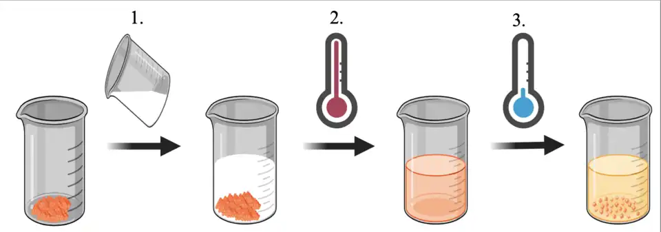 The simplest example of recrystallization is by temperature manipulation of a solution where the isolate compound has an endothermic dissolution (ΔH > 0) and a solubility product Ksp that increases with temperature. A saturated solution of the impure sample (usually in a disordered state of matter, such as a solid powder or a viscous liquid) is prepared near or at the boiling point of the solvent, and then the solution is slowly cooled to form a supersaturated solution where crystal nucleation (and thus formation) is imminent. [2]