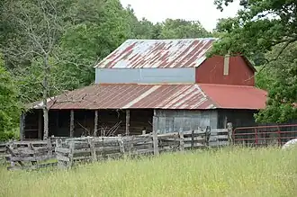 The Rector Log Barn is a historic barn in rural Izard County, Arkansas. It is located on the Rector Plantation, at the end of County Road 218, northwest of Melbourne. Its central portion, a log structure 2+1⁄2 stories in height, was built c. 1855, and is the only known example in the region of an antebellum era log barn. The main structure is flanked on all sides by 20th-century single-story shed-roof extensions, which serve in part to protect the historic log elements. The barn was built by Joseph William Rector, an early settler of Izard County, probably with the use of slave labor.[2]