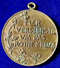 The Red Cross Medal was a German medal set up on 1 October 1898 by Wilhelm II. It had three classes and could be awarded to all those who carried out great service to the sick in peace or wartime, or for special achievement in the service of the German Red Cross. Though service to the sick during times of war had been recognized with prior awards of the Order of the Crown and General Honor Decorations with the Red Geneva Cross, Empress Augusta Victoria the royal patroness of the organization wanted an award to recognize work in peacetime as well.[3]