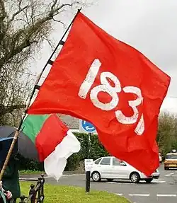 Two red flags soaked in calf's blood were flown by marchers in South Wales during the Merthyr Rising of 1831. It is claimed to be the first time that the red flag was waved as a banner of workers' power. The red flags of Merthyr became a potent relic following the execution of early trade unionist Dic Penderyn (Richard Lewis) in August 1831, despite a public campaign to pardon him.[8][9]