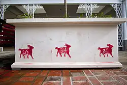 The red goats are stencils which were painted onto a number of white planters and other locations around Kingston's Stockade District from October 24–26, 2011. Varying reports claim that 32,[1] 33,[2] or 38[3] football-sized red goat stencils appeared throughout the uptown area.[4] The goats were placed on eleven planters which had been installed as part of a renovation project known as the Pike Plan, just prior to the project's dedication.[5] Numbers were painted over the goat stencilled designs the following night.[1][6]