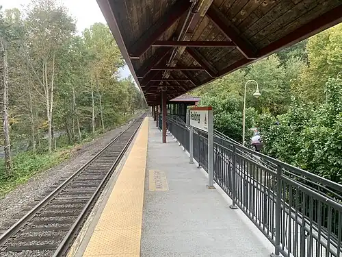 Redding station (also known as West Redding) is a commuter rail stop on the Danbury Branch of the Metro-North Railroad New Haven Line, located in Redding, Connecticut. The station has one two-car-long high-level side platform to the west of the single track.[3]: 27