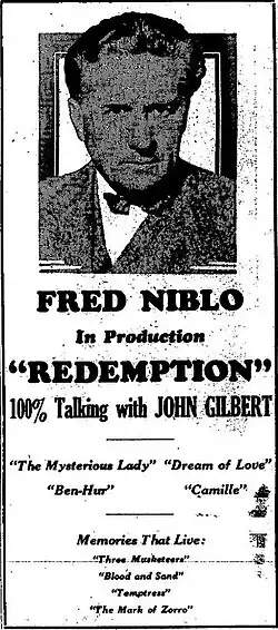 - ^ "'Redemption' (100% TF-D)—with John Gilbert", review, Harrison's Reports (New York City), May 10, 1930, p. 74. Internet Archive. October 22, 2019.