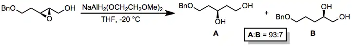 Epoxides are generally attacked by alkoxyaluminium hydrides at the less substituted position. A nearby hydroxyl group may facilitate intramolecular delivery of the hydride reagent, allowing for selective opening of 1,2-disubstituted epoxides at the position closer to the hydroxyl group.[24] The configuration at the untouched epoxide carbon is preserved.