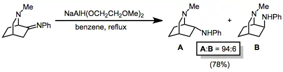 Imines are reduced by metal alkoxyaluminium hydrides to the corresponding amines. In the example below, use of the exo amine forms with high diastereoselectivity. The selectivity of hydride reduction in this case is higher than that of catalytic hydrogenation.[30]