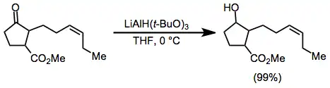 α,β-Unsaturated ketones may be reduced selectively in a 1,2 or 1,4 sense by a judicious choice of reducing agent. Use of relatively unhindered lithium trimethoxyaluminium hydride results in nearly quantitative direct addition to the carbonyl group (Eq. (9)).[21] On the other hand, use of the bulky reagent LTBA leads to a high yield of the conjugate addition product (Eq. (10)).[22]