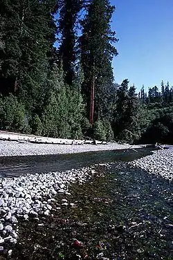 Slightly less than 20 miles (32 km) from the mouth, the river passes the southern boundary of Redwood National Park. It then receives Bridge Creek from the left, before winding through several groves of Sequoia sempervirens, more commonly known as redwood trees, from which the stream takes its name. Several of the tallest redwoods in the world are near the creeks banks. Near the small town of Orick it curves west, and receives Prairie Creek, its largest tributary, from the right. It empties into the Pacific Ocean about 30 miles (48 km) north of Eureka and 27 miles (43 km) south of Crescent City.[5]