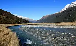 The Rees River (Māori language: Puahiri or Puahere)[1] is a headwater tributary of the Clutha River / Mata-Au that drains eastward of the main divide of the Southern Alps / Kā Tiritiri o te Moana in New Zealand. The river runs 41 km,[2] drains an area of 406 km2, and discharges into the head of Lake Wakatipu at Glenorchy. Bound by the Richardson (Whakaari) Mountains[3] to the east and the Forbes Mountains[4] to the west, its snow-covered headwaters rise above 2000 m.